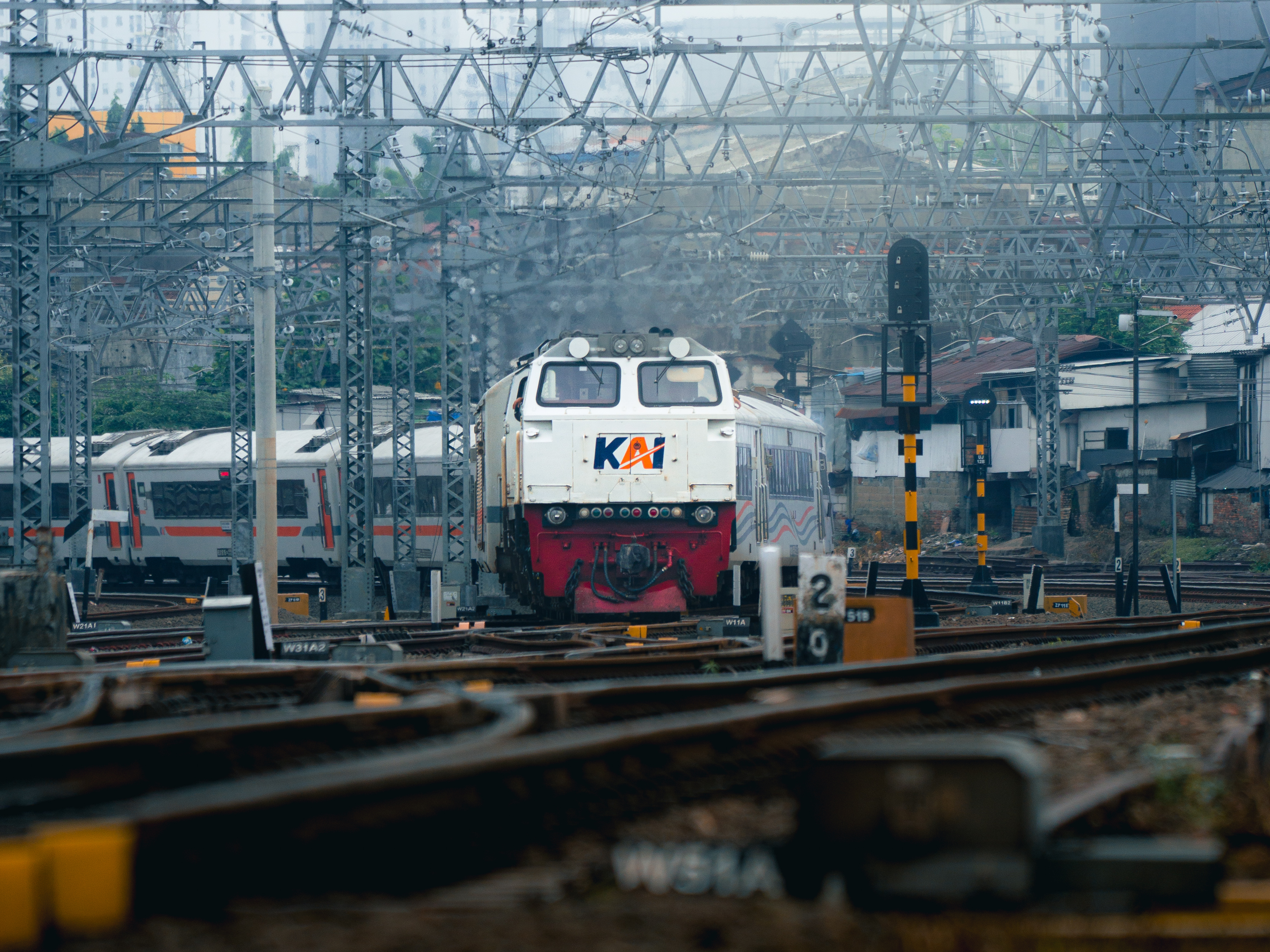 TM05-010 berpapasan dengan lokomotif berbunga di Stasiun Jakarta Kota